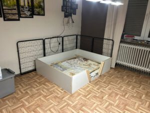15.03.2026 Sheenas Körperumfang hat sich massiv vergrößert. So langsam merkt man auch die ersten Welpenbewegungen im Bauch. Am Wochenende haben wir die neue Wurfbox zusammengebaut und aufgestellt. Jetzt ist alles bereit für die nahestehende Geburt. Sheena ist noch super fit.